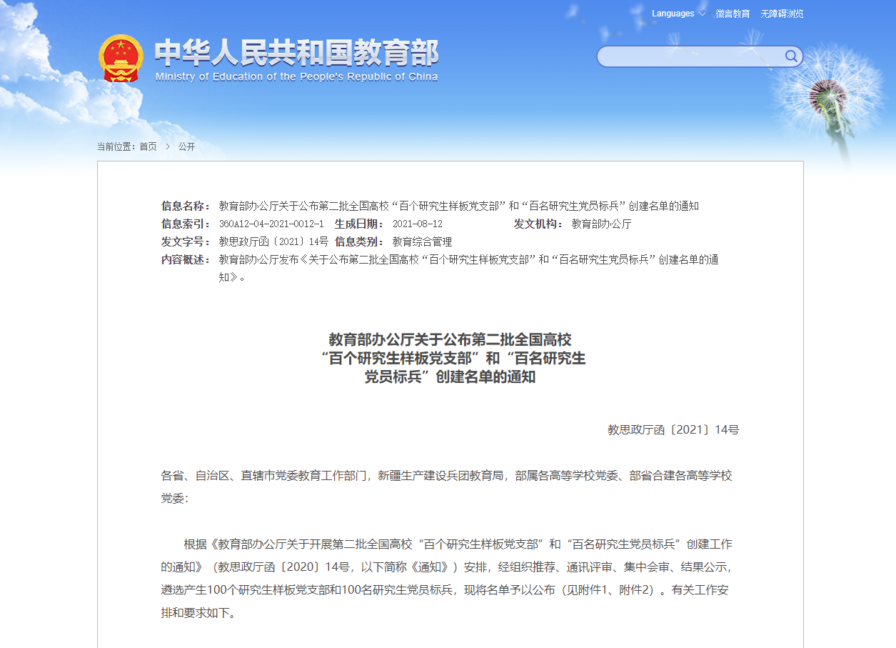 据悉,研究生党建“双创”活动是新时代高校党建示范创建和质量创优工作的重要组成部分,是新时代研究生党建工作的重要推动力量。根据《教育部办公厅关于开展第二批全国高校“百个研究生样板党支部”和“百名研究生党员标兵”创建工作的通知》(教思政厅函〔2020〕14号)安排,经组织推荐、通讯评审、集中会审、结果公示,遴选产生100个研究生样板党支部和100名研究生党员标兵。