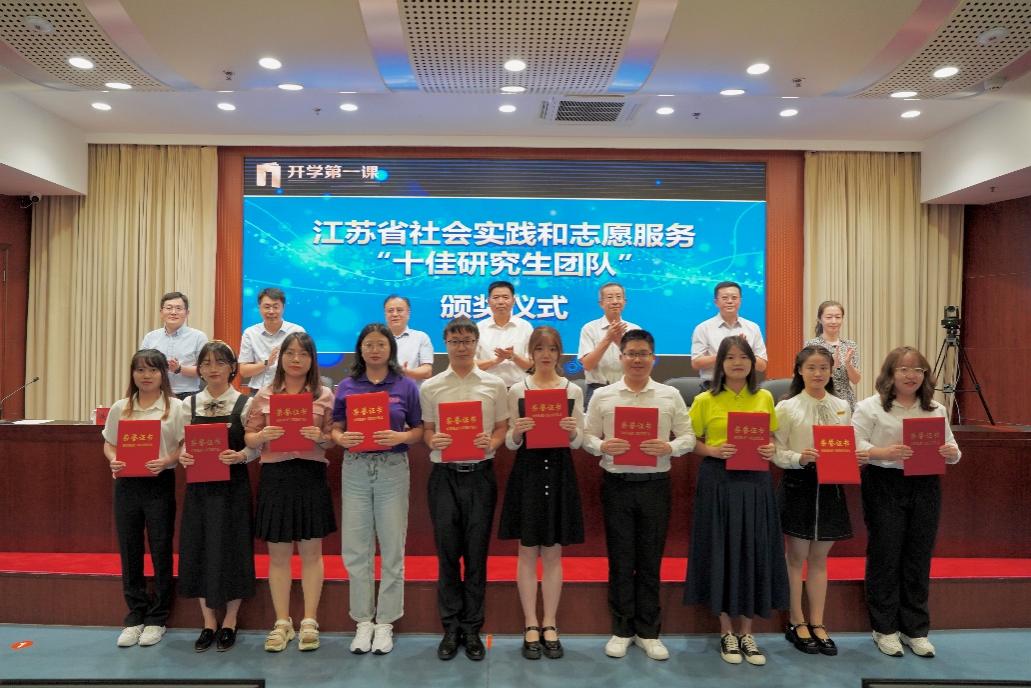 活动现场进行了江苏省社会实践和志愿服务“十佳研究生”“十佳研究生团队”颁奖仪式,我校经济管理学院硕士研究生葛真同学荣获江苏省社会实践和志愿服务“十佳研究生”,马克思主义学院“红话筒”政治理论宣教团荣获江苏省社会实践和志愿服务“十佳研究生团队”。
