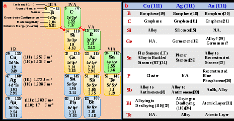 文章讲述了B、C、Si、Ge、Sn、P、Sb、Bi、Te等单元素二维材料在Cu、Ag、Au贵金属衬底上的制备与生长过程,归纳总结了在选择合适的衬底生长单元素二维材料方面元素周期表所提供的有价值的信息。要满足商业应用的需求,将这些独特的二维材料集成到器件中,所得材料的尺寸和质量仍有改进的空间,且仍然面临着生长、表征和加工方面的挑战。该评论文章不仅总结了元素周期表中第III A-VI A族热门单元素二维材料的生长规律,更为探索双元素二维材料的生长提供了新的思路。