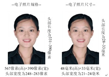 2.图像规格:567像素(高)× 390像素(宽),头部宽度为248~283像素,头部长度为331~390像素,分辨率300dpi,图像文件大小在20~200 kB,JPG格式。图像尺寸为48毫米(高)× 33毫米(宽),头部长度为28~33毫米,头部宽度为21~24毫米。