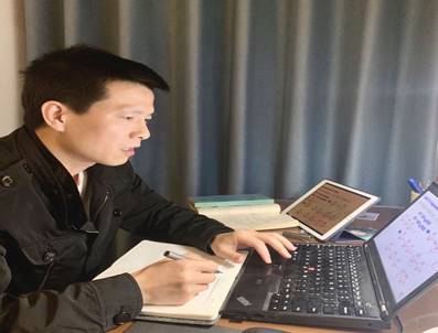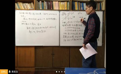 黄振友老师《Hilbert空间算子谱论》是数学系研究生的一门重要专业课,这门课难度较大且涉及较多的公式推导,为了不影响教学效果,黄老师决定采用手写板书的方式进行在线教学。为此,黄老师专门购买了屏幕专用笔,计划采用屏幕手写方式进行教学,但在试用阶段,发现网络传输不支持,无法使用;经过进一步考量,黄老师想到了利用家里平时就备有两块白板,采用“腾讯会议+微信群”的方式进行直播教学,这一方式达到了与在教室里上课一样的教学效果,同时还可以与学生实时交流。首次上课结束后,学生反馈教学效果很好。