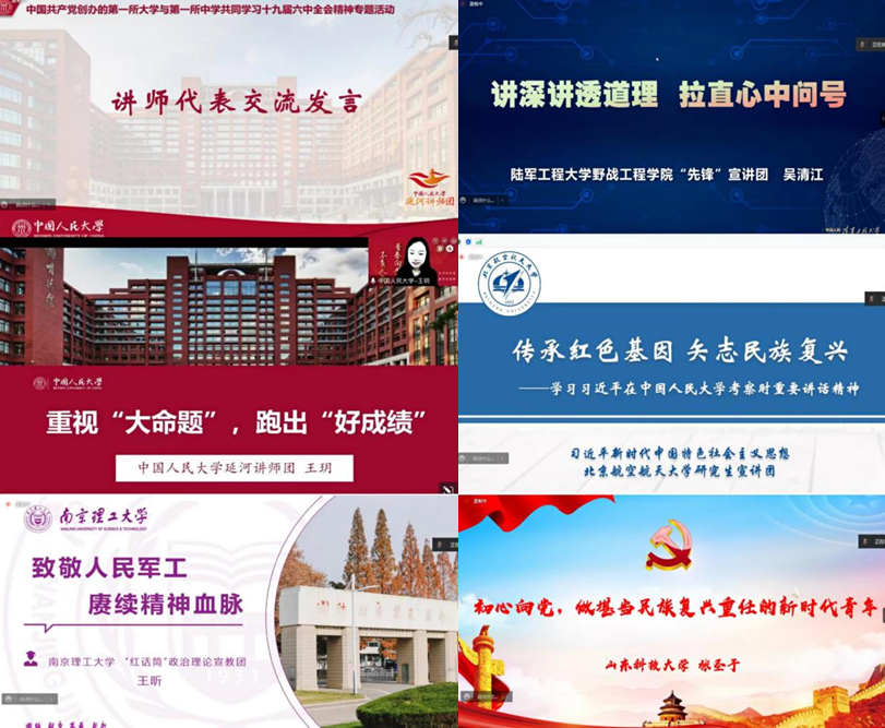 最后,来自各高校宣讲团、宣教团与讲师团的指导老师为本次联学活动的开展以及共同推进大中小学思政课一体化发展做点评总结。山东科技大学校团委书记尹立明总结了各大高校宣讲团的鲜明特色,指出创新型的思政教育、红色宣讲、高校联动,要进一步做广、做深、做久。陆军工程大学野战工程学院学员七大队政委吴广辉对青年学员提出了几点希望:一是要持续加强党的创新理论武装,先学先悟、深学深悟;二是要深刻理解思政课的本质,努力掌握基本遵循和方式方法。我校马克思主义学院党委副书记、纪委书记范彬表示,我校“红话筒”政治理论宣教团将进一步深入学习领会总书记的重要讲话精神,学习借鉴兄弟高校的先进经验和有效举措,推动学校社团的宣讲工作在思路、特色、运营、团队等方面继续优化。北京航空航天大学党委研究生工作部部长助理刘景超老师介绍了北京航空航天大学研究生宣讲团的基本情况,并指出,作为青年学生要把讲话精神贯彻落实到日常的科研、学习和工作中,作为思政工作者要讲好党的历史和理论知识。中国人民大学校团委副书记边策向与会人员提出了三点希望:在学深悟透上下更大功夫,在共情共鸣上下更大功夫,在知行贯通上下更大功夫,并希望各宣讲团队以此次活动为契机,探索建立高校学生理论宣讲团队长期合作的共建机制。