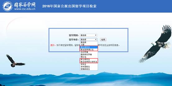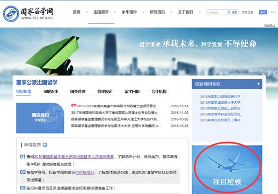 申请人进入国家留学网中出国留学栏目后,点击“项目检索”,可根据留学国别和留学身份进行检索,以选择适合自己的项目。并以2017年各类项目的时间要求为准。