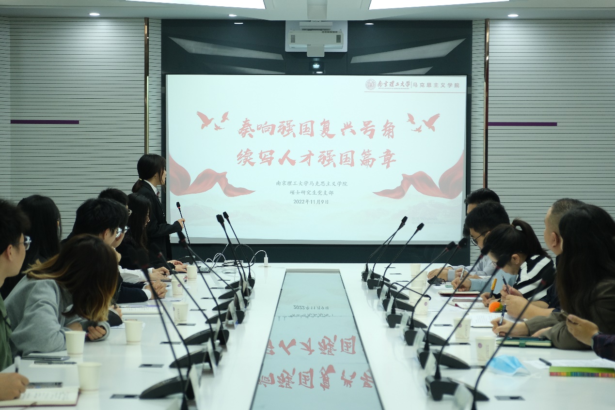 开展党的二十大精神专题党课。第一批全国高校“研究生样板党支部”马克思主义学院硕士研究生党支部学生代表席娜以“奏响强国复兴号角,续写人才强国篇章”为题为大家作党的二十大精神专题党课。党课通过讲述中国爆炸力学与核试验工程领域的著名专家林俊德,火炸药专家、国家最高科学技术奖获得者王泽山的故事展现了军工人才矢志不渝为强大国防作出的杰出贡献,南理工作为军工院校为国培养一大批具有国际水平的青年科技军工人才和高水平创新团队,作为青年军工人更应肩承使命,以己之力助国之昌威。