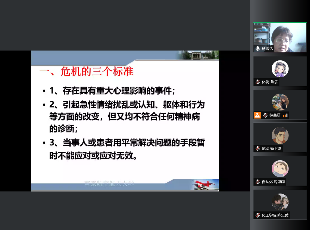 南京航天航空大学杨雪花老师进行了主题为“研究生常见心理危机的识别及应对”的培训讲座,此次讲座介绍了研究生可能会面临的心理危机、危机的识别以及解决等方面的问题,进而指导大家更加科学的开展工作。