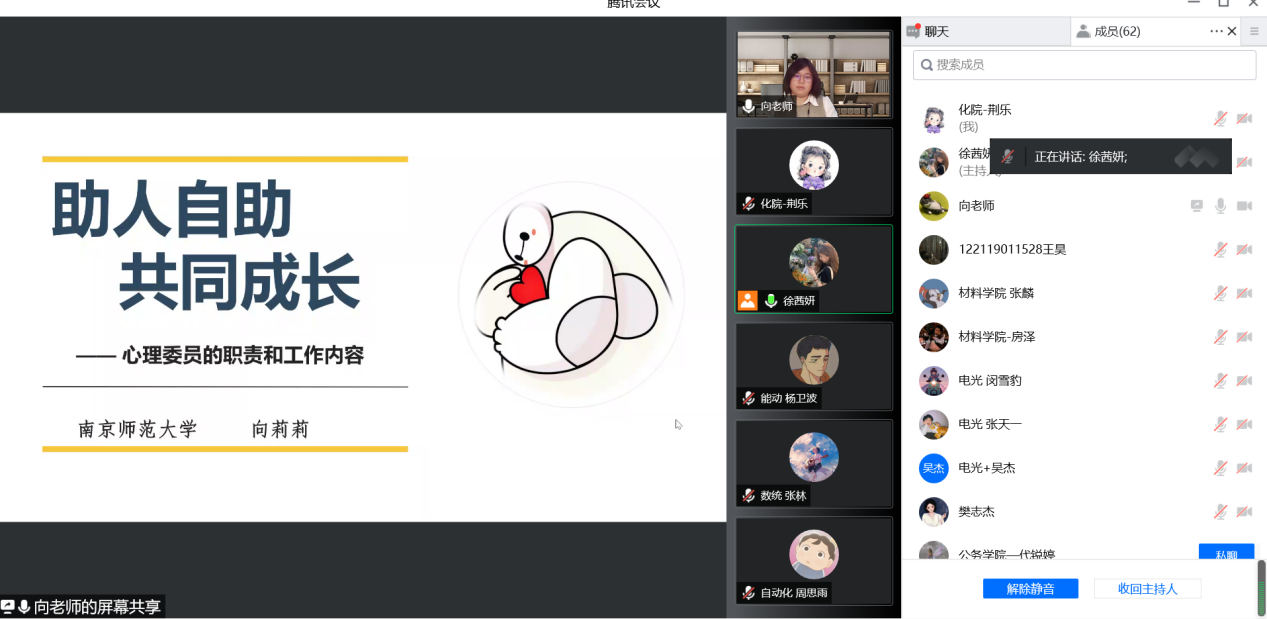 11月13日,培训班开班仪式在线上举行,化学与化工学院研究生辅导员徐茜妍以及各学院心理委员参加。开班仪式上,徐茜妍强调,当前研究生的心理问题需要得到充分的重视,通过此次培训希望大家提高相关素养,明确心理委员的职责,更好地服务关心班级同学。