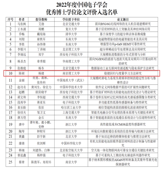中国电子学会(Chinese Institute of Electronics)成立于1962年,是5A级全国学术类社会团体,具有47个专业分会,覆盖了半导体、通信、微波、信号处理、电子材料等电子信息科学技术的所有领域。设立该奖是为了贯彻落实新时代人才强国战略,服务科技强国建设,充分发挥学会发现人才、培养人才、举荐人才的作用,推动电子信息领域的技术进步与创新,促进青年人才成长,壮大学会的会员队伍。按照《中国电子学会优秀博士/硕士学位论文评价办法》的文件要求,经过形式审查、专家函审和专家会审等程序,本次评审确定优秀博士学位论文和优秀硕士学位论文各25篇。