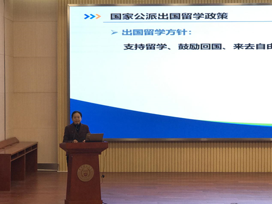 龙嫚主任对我校的国家公派出国留学工作进行了简要的总结,并对我校的工作给予了高度肯定。随后,龙嫚主任向我校师生解读了2019年国家留学基金委公派留学项目最新政策变化,介绍了包括高研访学博士后项目、高水平公派研究生项目、优秀本科生国际交流项目、创新型人才国际合作培养项目、中外合作奖学金、国际组织实习项目等留学项目2019年的申请要求、申请流程及注意事项。