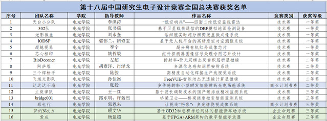 经过技术赛华东赛区初赛、商业计划书专项赛和企业命题赛的角逐,我校团队共获得一等奖25项,共有16支团队的作品入围全国总决赛。其中,我院李洪涛老师指导的“‘低空哨兵’——四面二维低空监视雷达”,张书瑞老师指导的“基于卫星载荷通信的DBF模拟地面检测设备”,刘永焘老师指导的“活细胞实时超分辨荧光显微成像系统”,郭伟兰、隋修宝老师指导的“基于无人机平台的高精度空对空测距系统”,李宁老师指导的“超分辨有机红外成像芯片”,姚哲毅老师指导的“红外探测器图像信号处理专用芯片设计”获技术竞赛全国一等奖。李洪涛、张书瑞、刘永焘、郭伟兰、李宁、姚哲毅6位老师获得优秀指导教师奖。