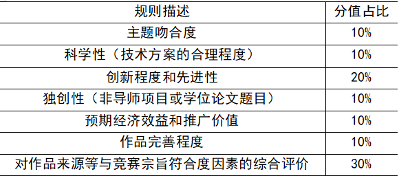 每件作品安排 3 名评委进行评审,并采用专家回避制度,即专家不评审自己所在高校的作品。3 名专家依据评分细则对作品进行评分,评分细则如下:
