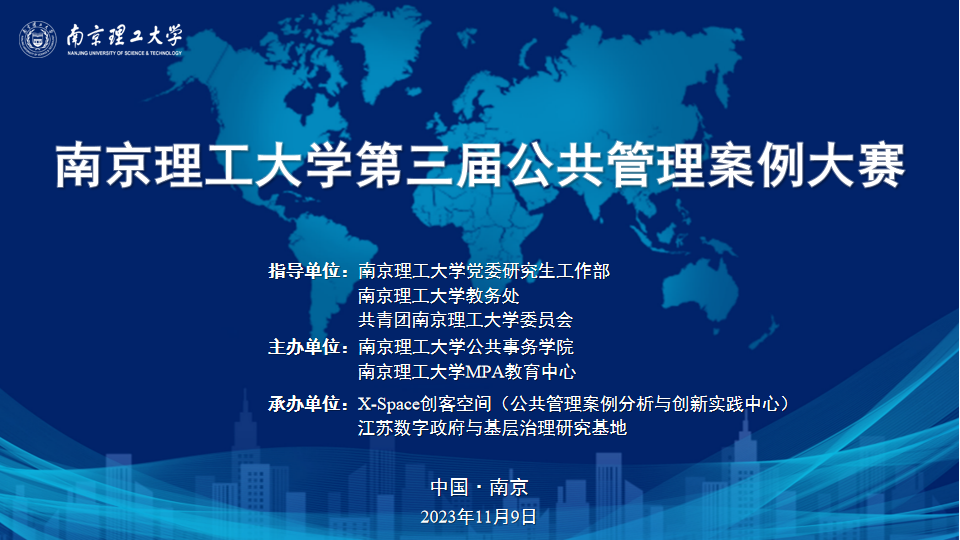 11月9日,南京理工大学第三届公共管理案例大赛决赛在公共事务学院举行。本次公共管理案例大赛由校党委研究生工作部、教务处、共青团南京理工大学团委指导,公共事务学院、校MPA教育中心主办。出席大赛的领导专家有南京大学政府管理学院副院长周建国教授,江苏公共管理学科联盟理事会秘书长、江苏大学公共管理学科带头人周绿林教授,南京师范大学MPA教育中心主任赵晖教授,校团委书记凌晨,公共事务学院党委书记黄磊,院长高蓓蕾,副院长赵奇栋,院党委副书记徐蔡余以及况志华教授,程倩教授,章荣君教授,徐志国教授以及学科建设、学生服务管理等相关负责人。校MPA教育中心、数字政府与基层治理研究中心主任范炜烽教授主持大赛开幕式。