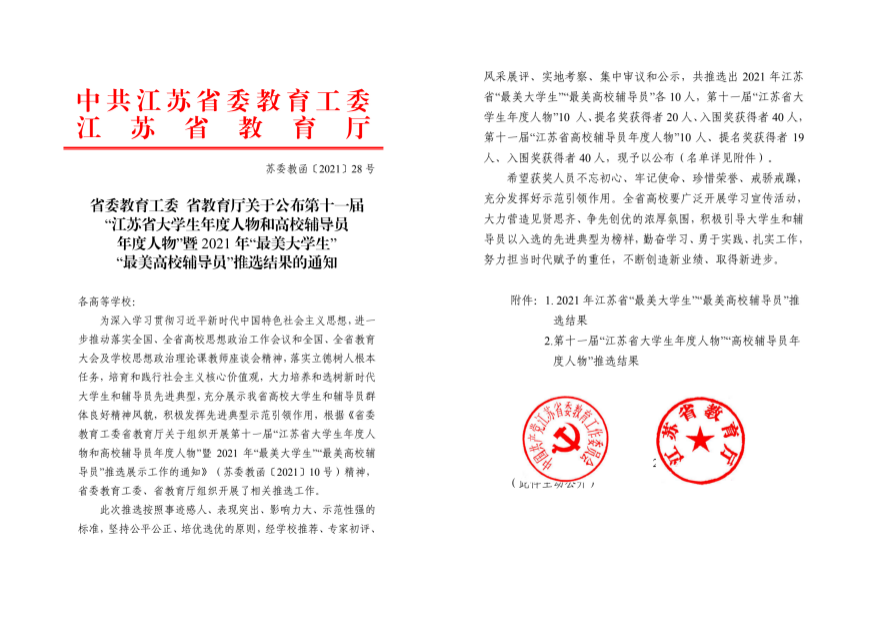 此次推选按照事迹感人、表现突出、影响力大、示范性强的标准,坚持公平公正、培优选优的原则,推选工作自今年5月份启动,收到来自江苏省上百所高校的推荐人选,经学校推荐、专家初评、风采展评、实地考察、集中审议和公示,共推选出2021年江苏省“最美大学生”“最美高校辅导员”各10人,第十一届“江苏省大学生年度人物”10人、提名奖获得者20人、入围奖获得者40人,第十一届“江苏省高校辅导员年度人物”10人、提名奖获得者19人、入围奖获得者40人。